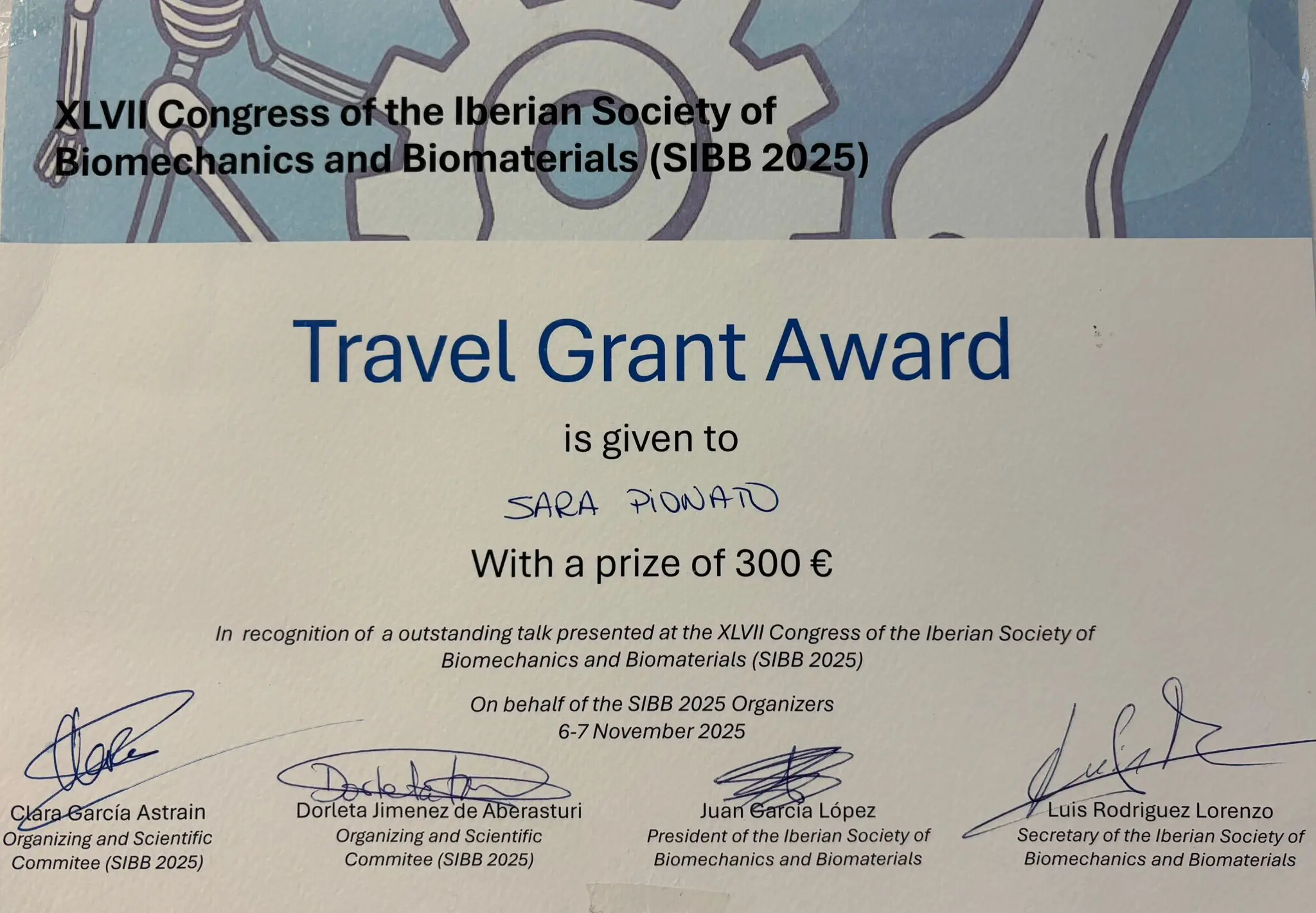 Sara Pionato won a Travel Grant for the oral presentation entitled “Thermoresponsive ELR Hydrogels for Soft Actuation via Isotropic Chain Recoil” at the XLVII International Congress of the Iberian Society of Biomechanics and Biomaterials, held in San Sebastian, Spain.